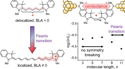 A Peierls Transition in Long Polymethine Molecular Wires: Evolution of Molecular Geometry and Single-Molecule Conductance